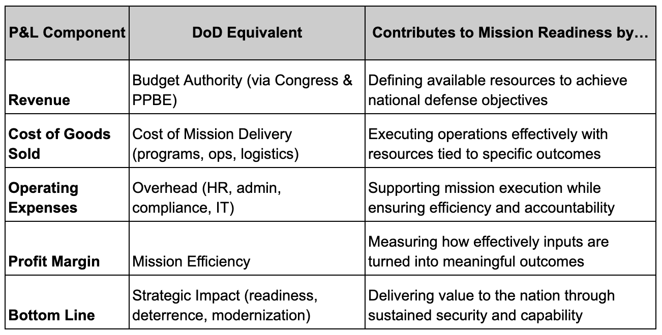 In a recent interview, I was asked about my experience managing Profit and Loss (P&L) statements. It was a familiar question from my time in the private sector—but it made me pause. Not because I lacked the experience, but because the P&L isn’t a standard tool in the Department of Defense. That got me thinking: How can a leader from industry transition into the DoD and still apply the same drivers that a P&L would sharpen in a commercial context?